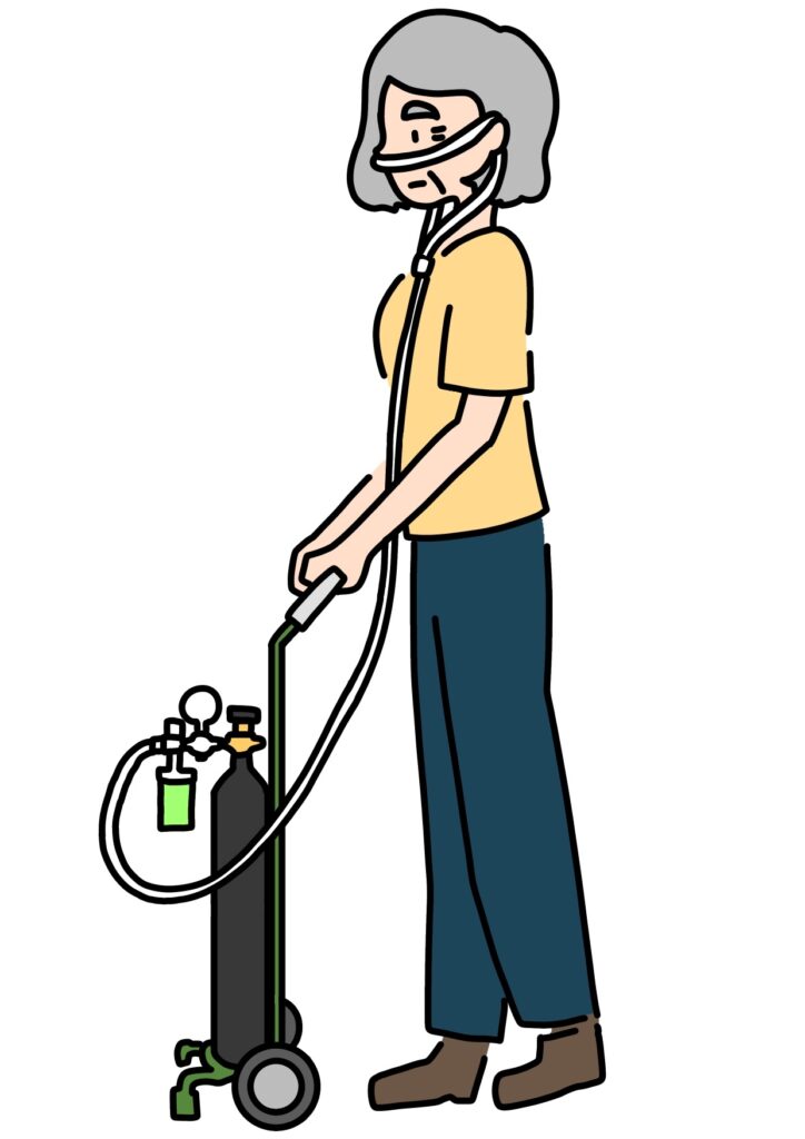 呼吸困難が進行すると、酸素ボンベを使うようになります。