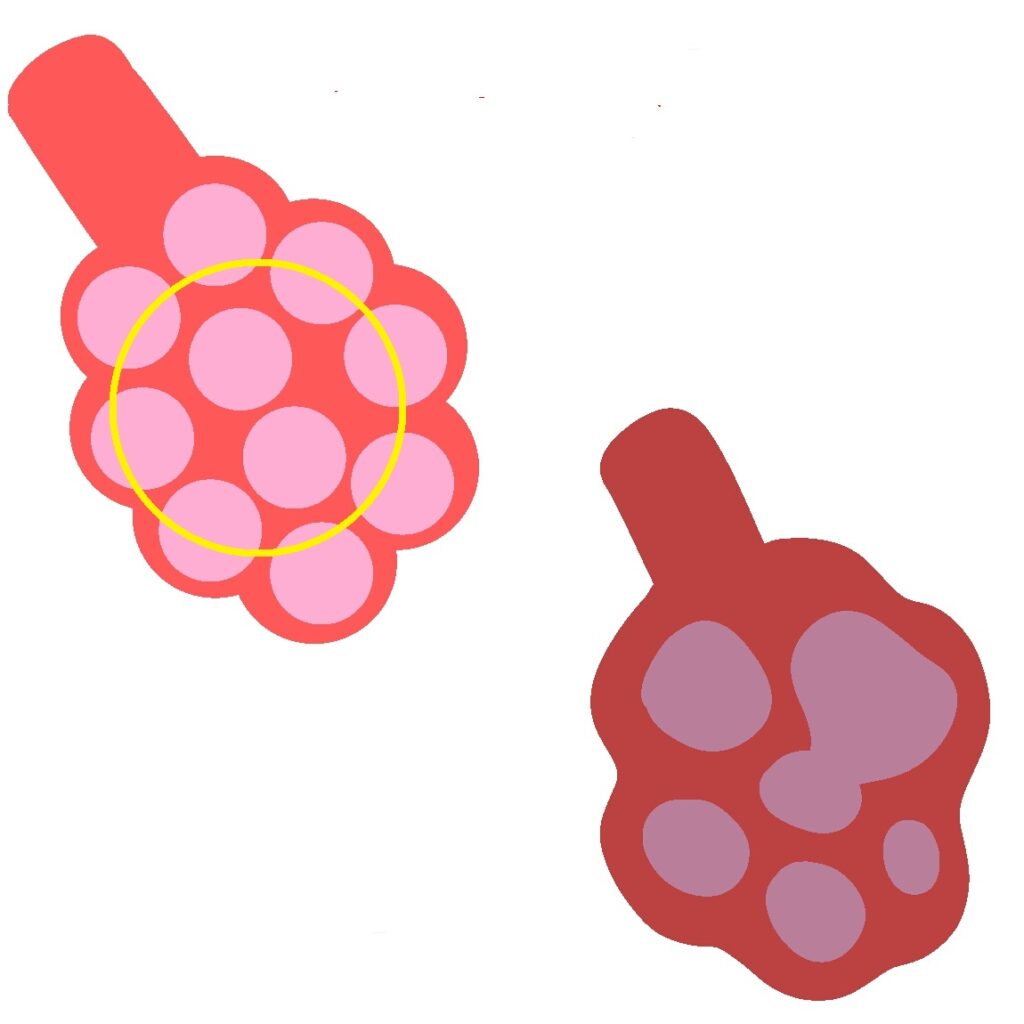 肺気腫は、肺胞が壊れて機能を果たさなくなる病気ですが、壊れた肺胞だけが不健全で、他の肺胞が健全ということはありません。
